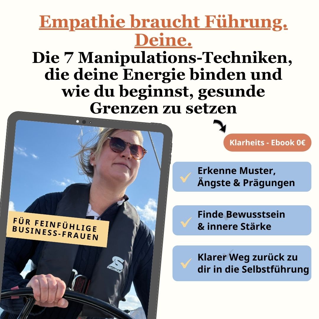 Dann hol dir mein 0€ Klarheits-Ebook „Empathie braucht Führung“: Die 7 Manipulations-Techniken, die deine Energie in Beziehungen binden und wie du beginnst, klare energetische Grenzen zu setzen, ohne dich weiter zu verlieren